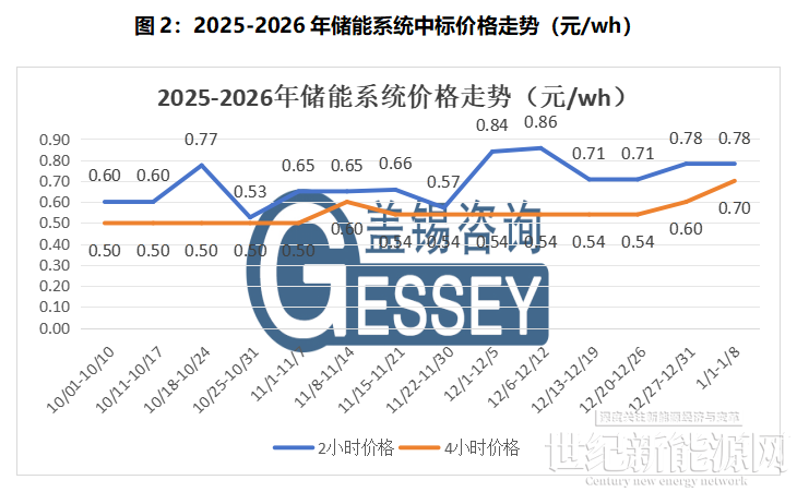 2026年1月第一周,4小時儲能EPC平均中標價格0.898元/Wh,環比下降13.67%;2小時儲能EPC平均中標價格1.092元/Wh,環比下降10.95%。