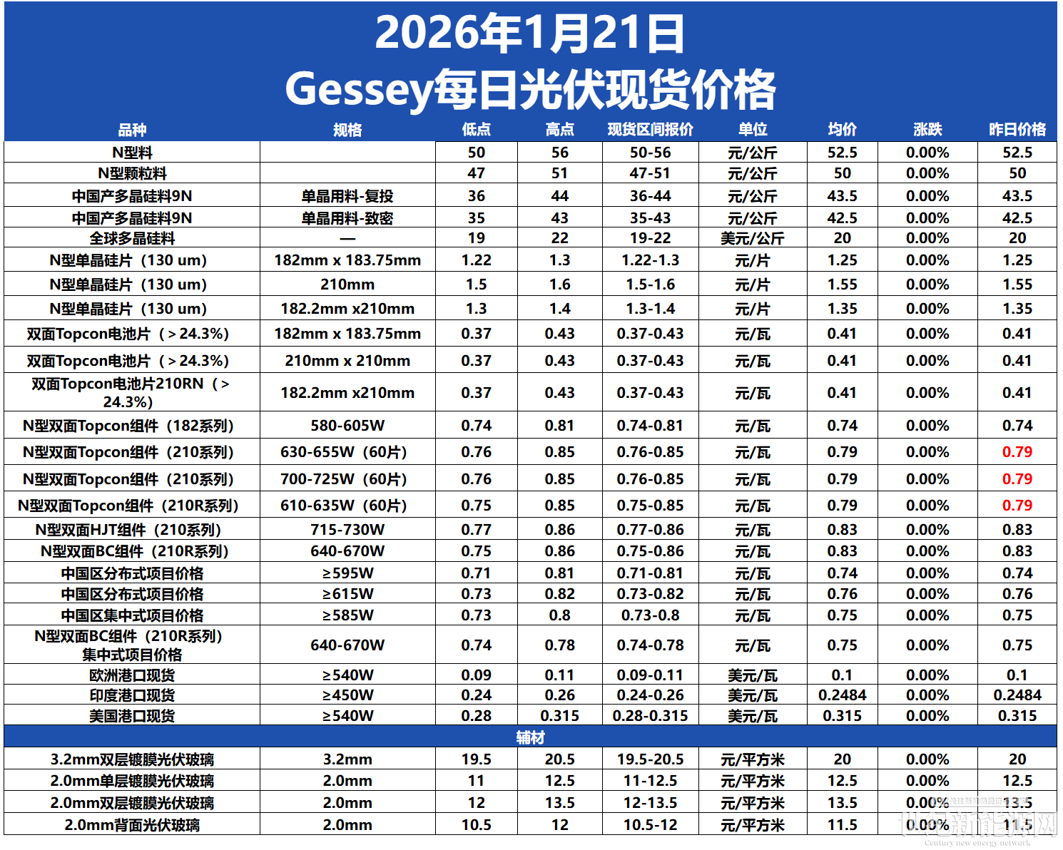 今日組件價格整體維穩,N型雙面Topcon 組件(182系列)價格在0.74-0.81元/ 瓦,均價為0.74元/瓦。N型雙面Topcon 組件(210系列)價格在0.76-0.85元/ 瓦,均價為0.79元/瓦。N型雙面Topcon組件(210系列)(700-725W(60片)價格在0.76-0.85元/ 瓦,均價為0.79元/瓦。N型雙面Topcon組件(210R系列)(610-635W(60片))價格在0.75-0.85元/ 瓦,均價為0.79元/瓦。N型雙面HJT組件(210系列)價格在0.77-0.86元/ 瓦,均價為0.83元/瓦。N型雙面BC組件(210R系列)價格在0.75-0.86元/ 瓦,均價為0.83元/瓦。中國區分布式項目(≥595W)價格在0.71-0.81元/瓦,均價為0.74元/瓦,中國區分布式項目(≥615W)價格在0.73-0.82元/瓦,均價為0.76元/瓦,中國區集中式項目(≥585W)價格在0.73-0.8元/ 瓦,均價為0.75元/瓦。N型雙面BC組件(210R系列)集中式項目價格在0.74-0.78元/ 瓦,均價為0.75元/瓦。歐洲港口現貨價格在0.09-0.11美元/ 瓦,均價為0.1美元/瓦。印度港口現貨價格在0.24-0.26美元/ 瓦,均價為0.2484美元/瓦。美國港口現貨價格在0.28-0.315美元/ 瓦,均價為0.315美元/瓦。