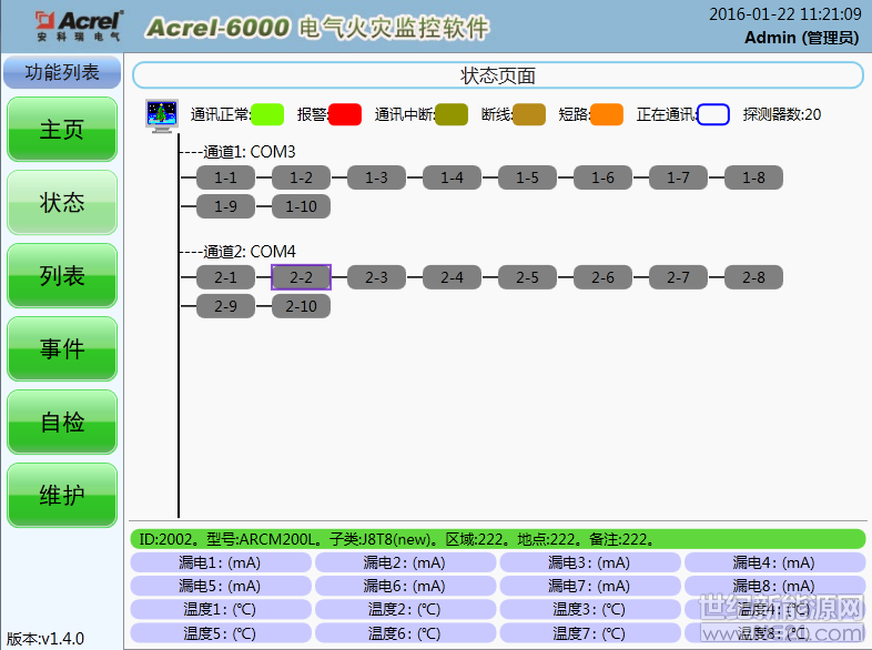 本套上位機軟件Acrel-6000電氣火災系統。主要有以下功能特點:友好的人機界面,可實時和定時采集現場設備的剩余電流數據,并有報警提示聲光報警等功能。客戶可根據實際需要對漏電流報警值進行設置,報警故障解除時,可遠方進行復位。系統可對報警事件、日期、報警值、越線值進行記錄,并生成報表,可對報警事件記錄進行打印。