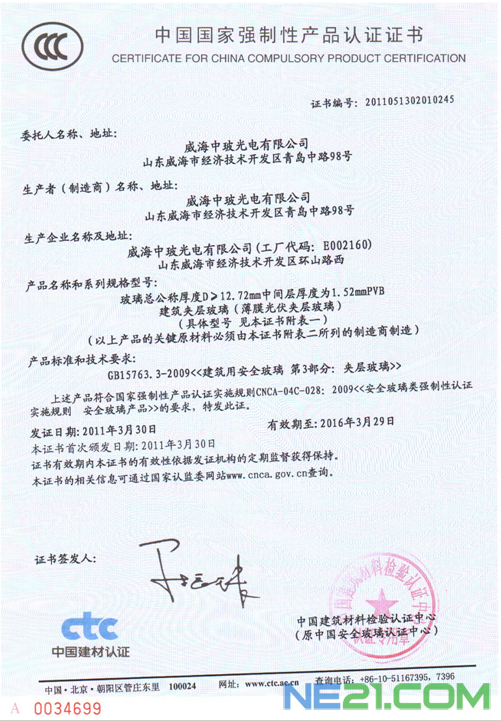 本文標題: 威海中玻通過中國國家強制性產品認證