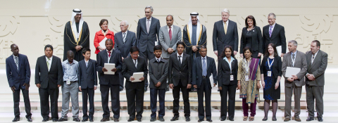 Masdar首席執行官兼Abu Dhabi Ports Company董事長Sultan Ahmed Al Jaber博士(后排左一)、毛里塔尼亞總統穆罕默德•烏爾德•阿卜杜勒•阿齊茲(后排左五)、阿布扎比王儲兼阿聯酋武裝部隊副總司令Sheikh Mohamed bin Zayed Al Nahyan將軍(后排左六)、冰島總統奧拉維爾•拉格納•格里姆松(后排左7)和科索沃總統阿蒂費特•亞希亞加(后排左8)與2013年“扎耶德未來能源獎”獲獎者在阿布扎比的酋長國宮殿酒店的合照(照片:美國商業資訊)