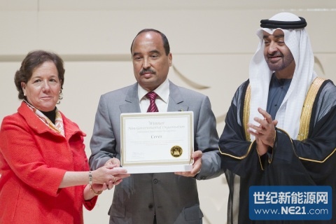 阿布扎比王儲兼阿聯酋武裝部隊副總司令Sheikh Mohamed bin Zayed Al Nahyan將軍(右一)和毛里塔尼亞總統穆罕默德•烏爾德•阿卜杜勒•阿齊茲(中間)為Ceres首席執行官Mindy Lubber(左一)頒發2013年“扎耶德未來能源獎”非政府組織類獎項(照片:美國商業資訊)