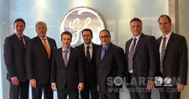 從左向右分為為:Sylvio Konrad、GE Power Conversion 銷售總監(jiān)Stephan Reimelt、 GE Energy Germany首席執(zhí)行官 Mr. Bernhard Beck、BELECTRIC首席執(zhí)行官 Constantin Benzlik、Padcon首席執(zhí)行官 Francesco Falco、GE Power Conversion能源部門高管 Mario Willatowski、Solar GE Power Conversion歐洲&亞洲可再生能源部門業(yè)務(wù)總監(jiān)Ulrich Weller