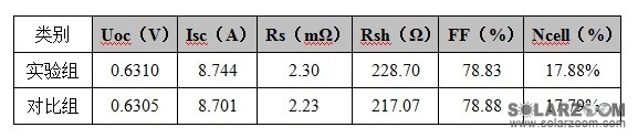 經過制絨后的兩組硅片,正常生產制成電池片,擴散同管同舟,刻蝕同設備,鍍膜同管同舟,印刷同設備,測試電池片的電性能數據如表一所示: