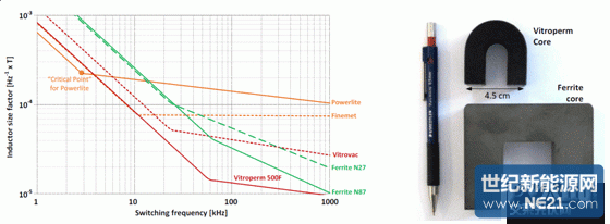 圖 2. 用作頻率函數的不同芯材的電感器大小,以及與 Vitroperm 和鐵氧體磁芯的大小比較