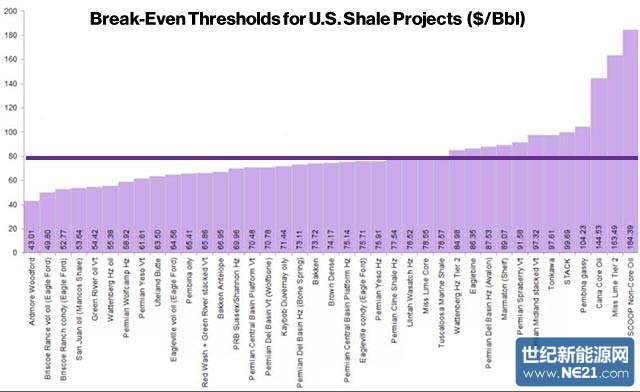 也有分析者認為,即使油價跌破80美元/桶,包括Bakken和Eagle Ford這兩大最重要頁巖油產區在內的頁巖油仍然可以實現盈利,甚至Eagle Ford地區的部分項目在油價跌至50美元時也能盈利。以下是一張頁巖項目的盈虧平衡點示意圖