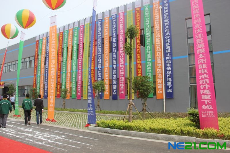 世紀新能源網記者孫文艷現場報道,5月9日10:08分,湖南共創光伏科技有限公司舉行盛大開工投產儀式,伴隨著第一塊高效硅基薄膜太陽能電池成功下線,標志著共創光伏一期50MW項目正式量產。該項目總投資超過20億元,建設年產200MW硅基薄膜太陽能電池模組生產基地,其中首期建設規模50MW,全套引進瑞士歐瑞康最新量產的微晶硅疊層薄膜太陽能電池生產線,光電轉化率達到10%以上,居于全球同類產品領先地位。