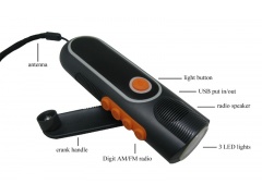 產品介紹: 1.夜光效果,黑夜易找易取 2.手搖發電,無需電源適配器充電 3.環保LED照明燈,警報功能適合緊急求救 4.高靈敏度AM/FM收音機 5.可供不同手機及數碼產品充電 產品規格: 1.材質:ABS、PS 2.LED燈的規格:¢5; LED的亮度:8000~12000MCD; 3.電池類型:鋰電3.7v 300mah 4.手搖1分鐘(120轉/分鐘):a)照明可用20分鐘, b)手機接聽可用20-30秒,待機可達10-15分鐘.